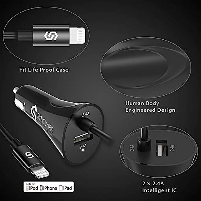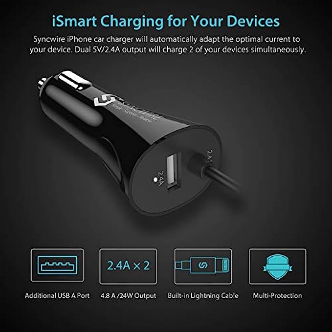 • I-smart design - the combination of lightning cable and additional USB port allows Syncwire Lightning car charger Charge any two devices simultaneously with max up to 4.8a output, and it automatically adapts the output to each one accordingly.