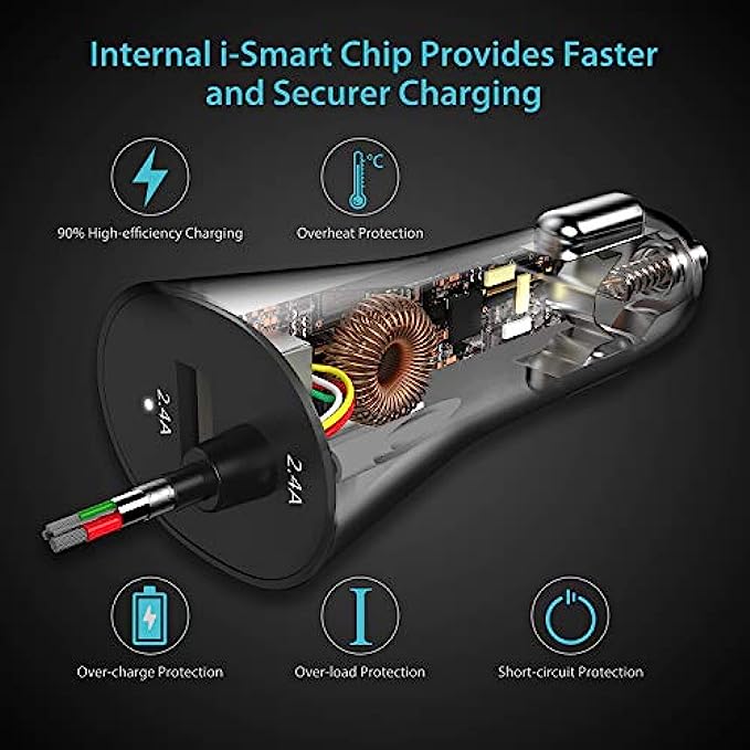 • Lightning-fast i-Smart USB car charger - compatible with Apple iPhone 13/12/11/XS/XS Max/XR/X/8/8 Plus 7/7 Plus/6S/6S Plus/6/6 Plus/SE/5S/5C/5/iPad/iPod. Additional USB port can charger any other USB-powered devices including Samsung Galaxy, Note, Nexus, HTC, Sony, LG, tablet, power bank and more.