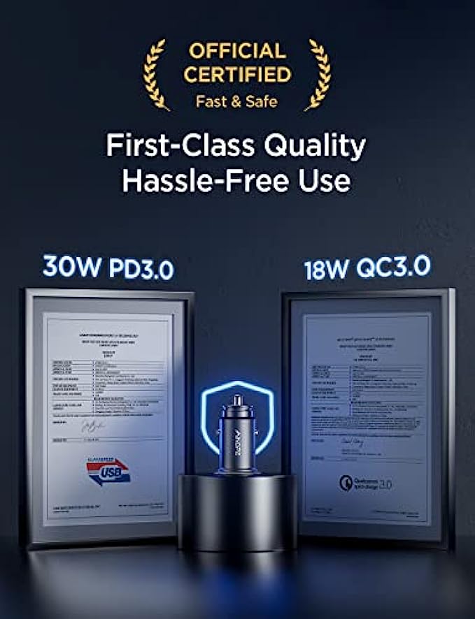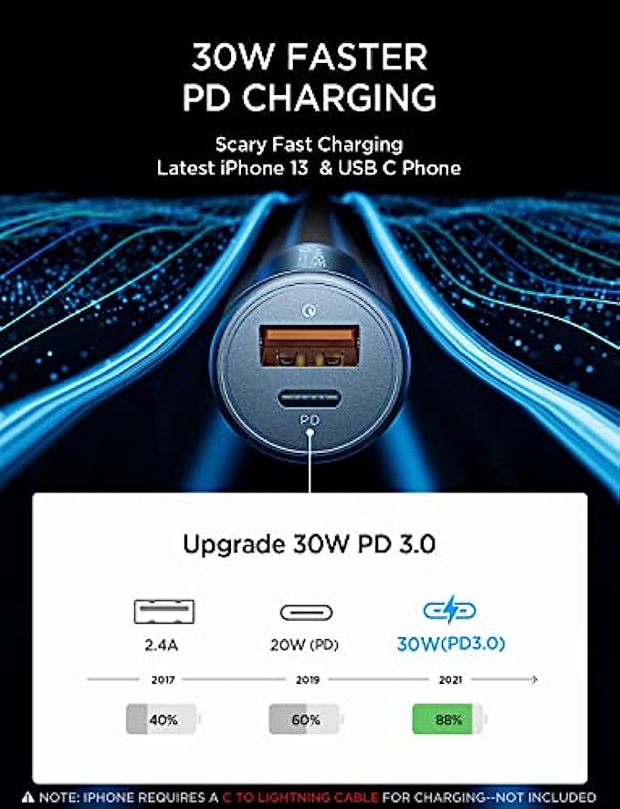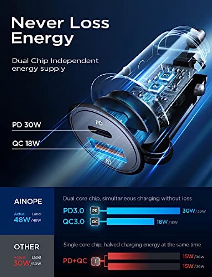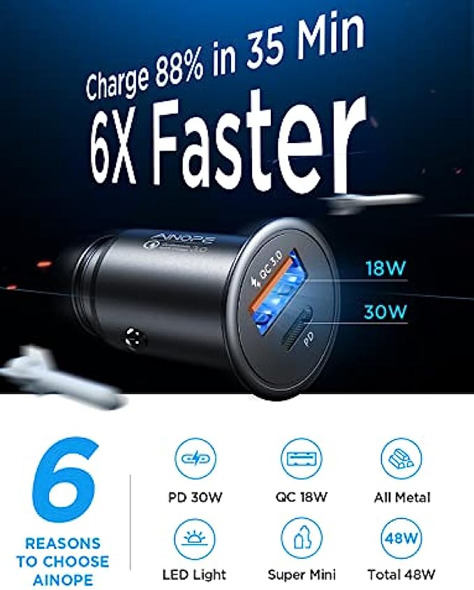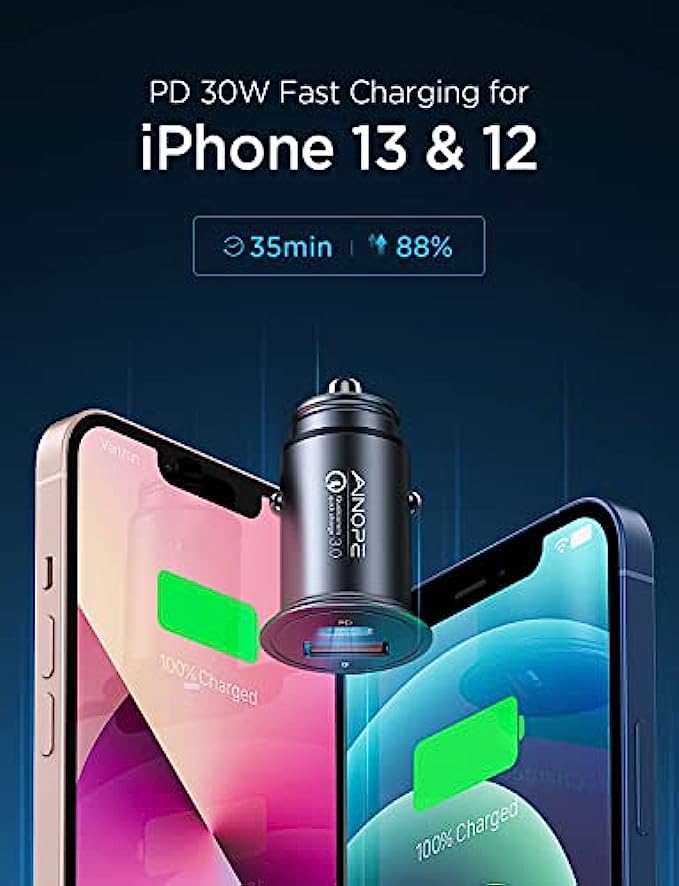 ⚡EFFICIENT QUICK CHARGING: AINOPE 48W fast USB C car charger supporting PD 30W(Max) and QC 18W(Max) high output, can fast charge all prevailing phones at the same time. The PD 30W port, 6X faster than 2.4A charger, can fast charge iPhone 13/12/12 Mini/13 Pro/13 Pro Max/11/Pro/Max, and super fast charging Note 20/10/10+, Galaxy S21/20/10 with highest speed, etc. Quick Charge 3.0 port, charges most of android devices from 0% to 88% within 35 minutes.